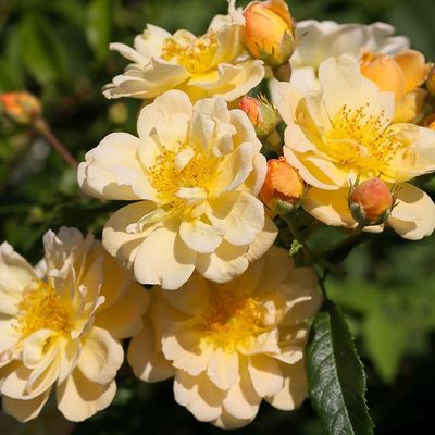 Clusters of petite butter yellow, semi-double flowers, fading into soft lemon. Free flowering and bee friendly. This plant produces bendy shoots which can easily be shaped into any form. Repeat flowering, bushy grower. 2.3